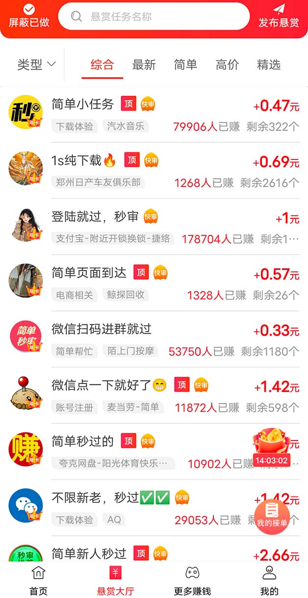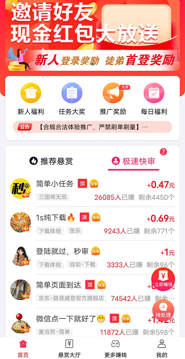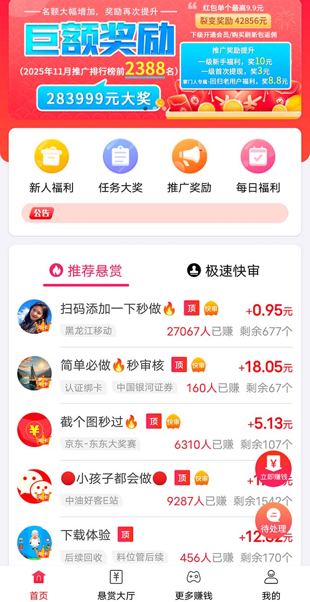 1、海量任务10万+,新人奖励多,1元秒提现。